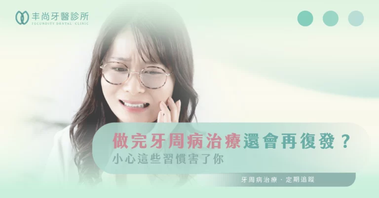 許多患者常問,牙周病治療後為何又復發?其實,牙周病治療分為「基礎」、「手術」與「維護」三階段。我們豐尚牙醫強調,維護階段的定期回診與良好口腔習慣至關重要,如同高血壓、糖尿病需長期管理。復發常見原因包含清潔不確實、抽菸、不良飲食、壓力和未定期回診。牙周病不可怕,可怕的是治療後疏於照顧。只要您願意從生活習慣改變,並配合我們專業團隊的治療與追蹤,牙周病便不再是困擾。三重丰尚牙醫將細心陪伴您,讓您重拾口腔健康。